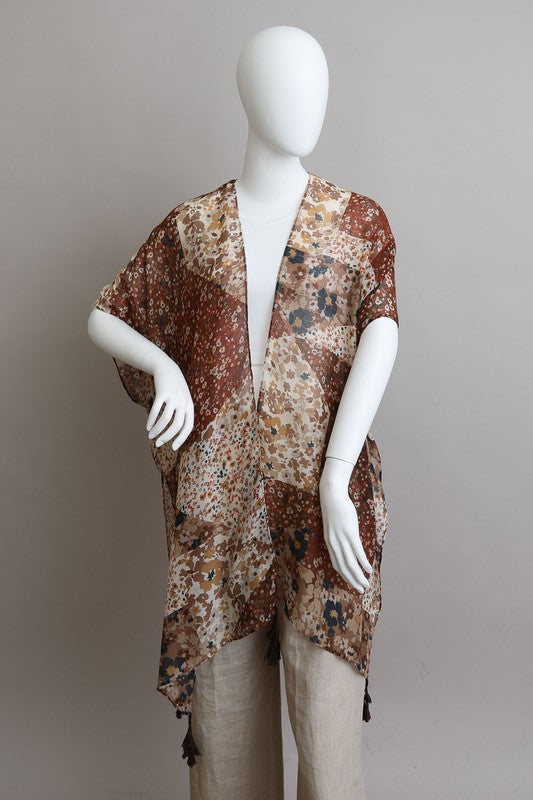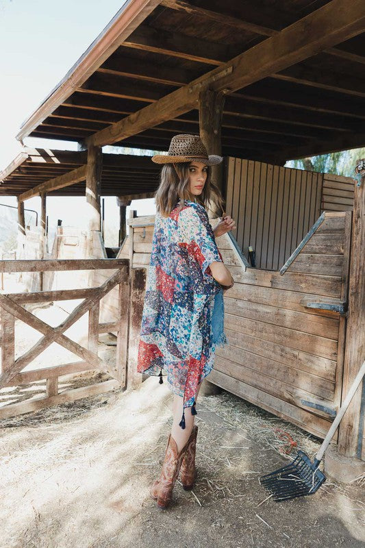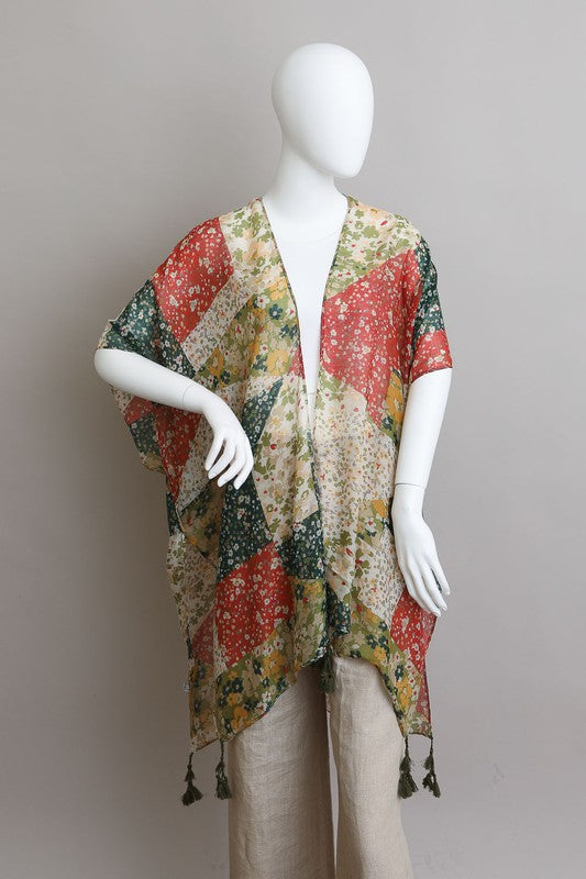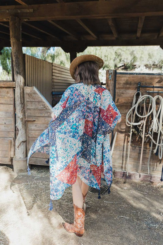 Enjoy our Bohemian allover patchwork floral kimono with flowy draped sleeves perfect for the upcoming season.