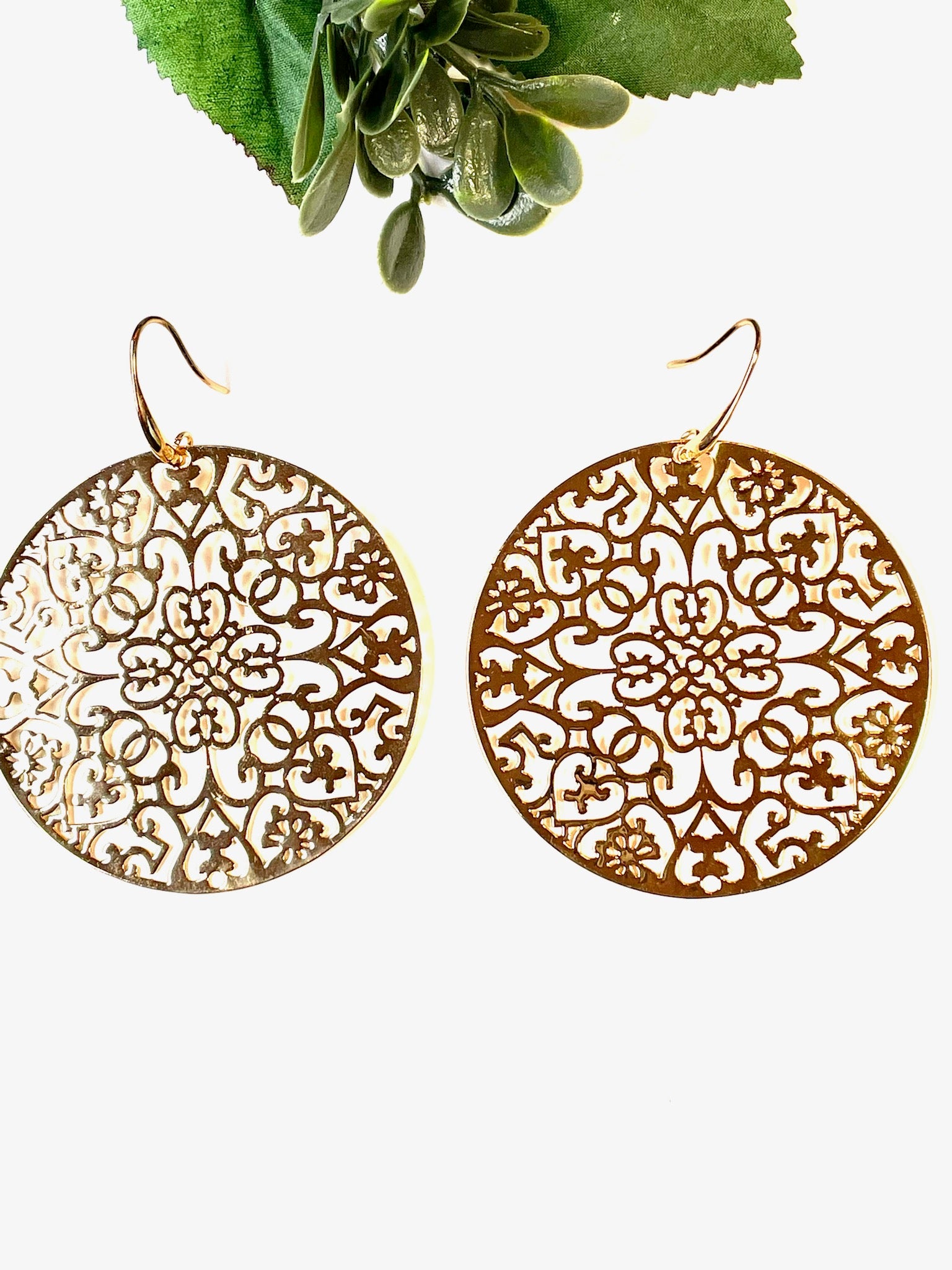 These elegant Bohemian gold earrings feature a stylish combination of geometric and floral designs in a round statement drop style that looks amazing when worn. Add an extra special touch to your outfit with these stunning gold earrings, which pair beautifully with blouses, tops, and dresses.
