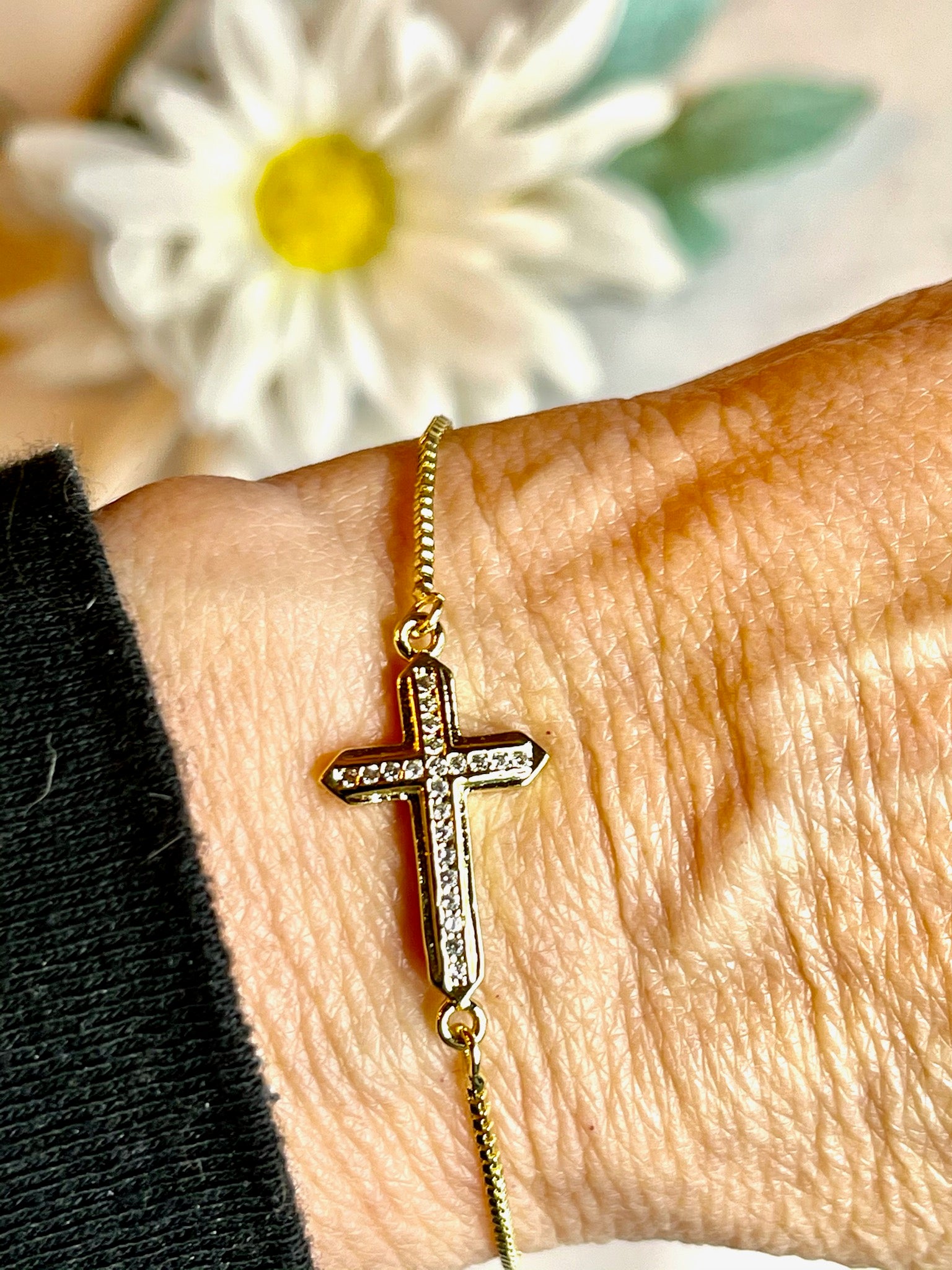 This beautiful, trending inspirational cross bracelet is available in gold or silver-plated and accented with sparkling CZ stones. A lovely way to showcase your faith, this adjustable bolo bracelet looks stunning on the wrist. Wear it alone for a delicate statement or layer it with other bracelets to complete your look