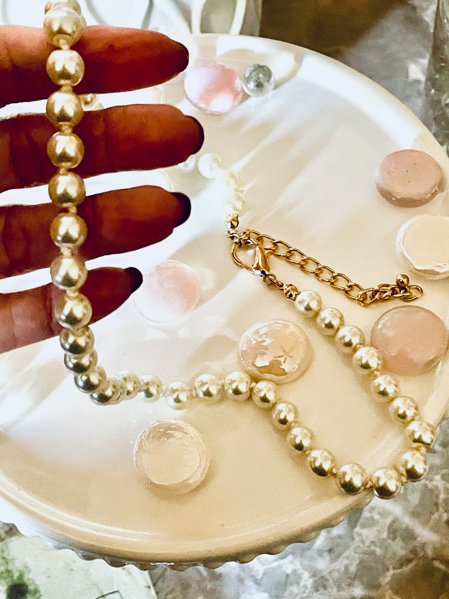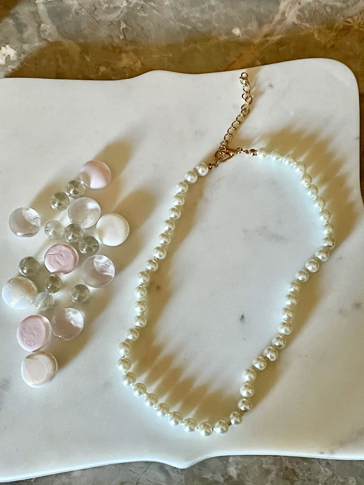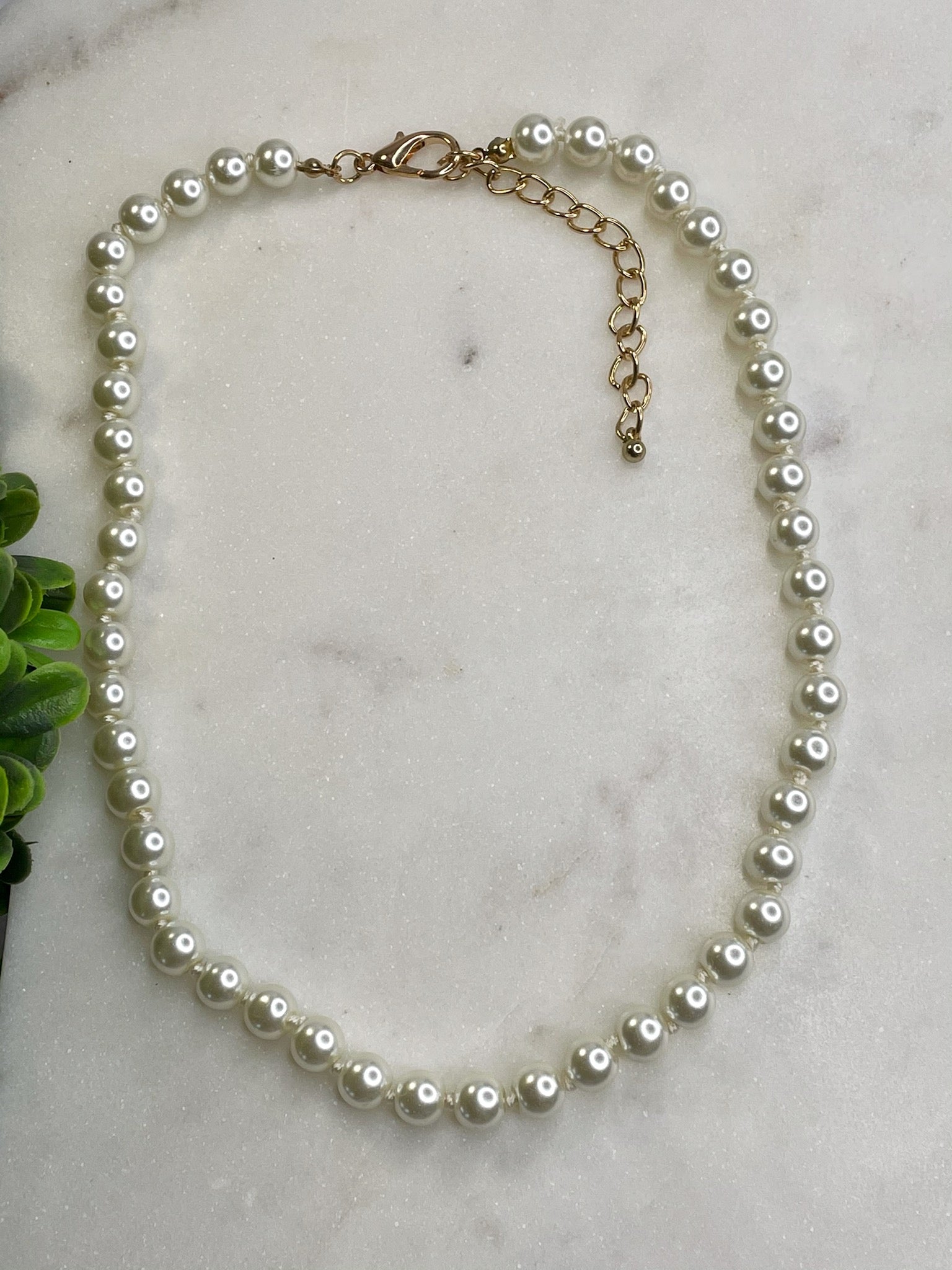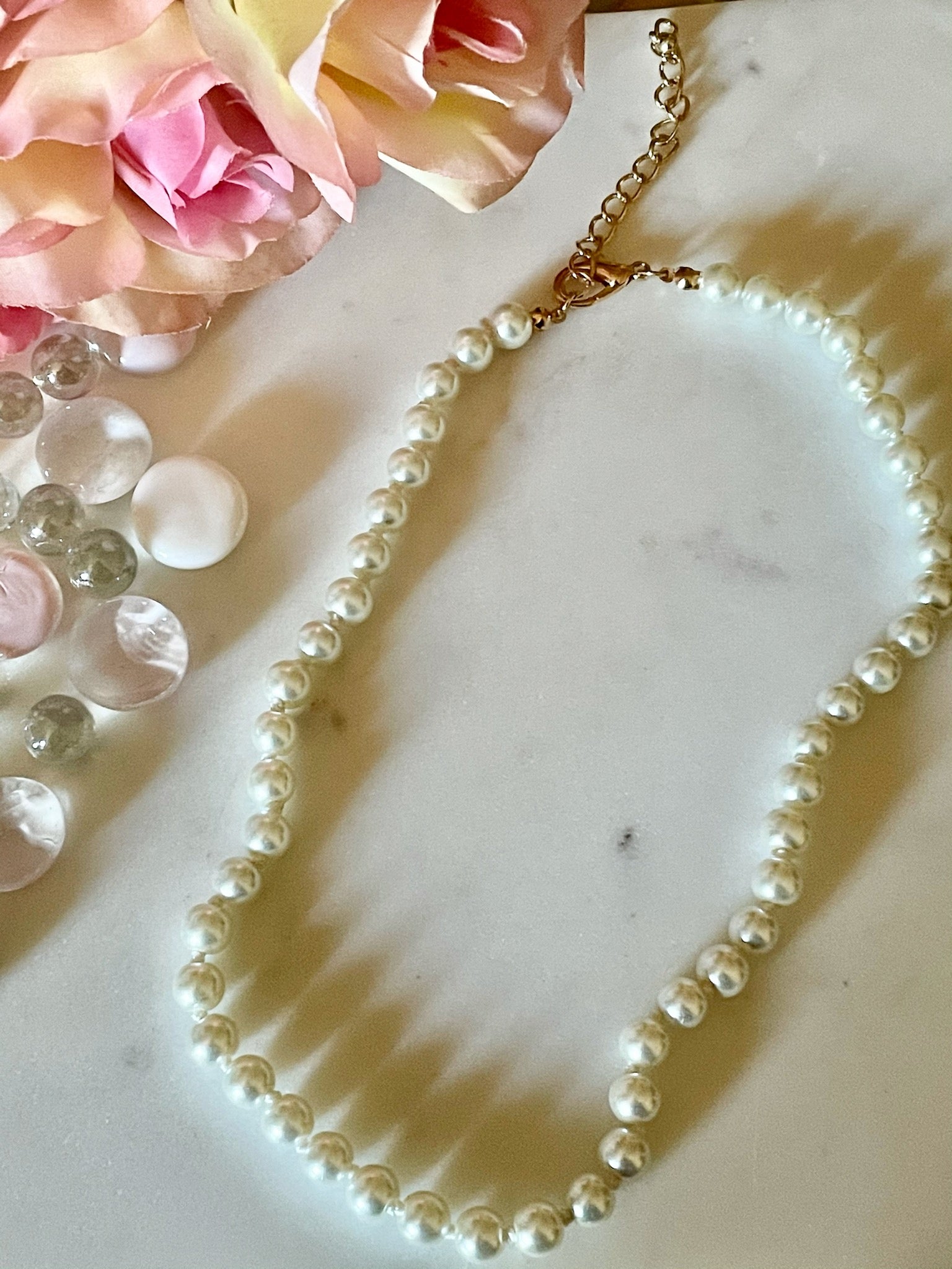 Beautiful quality white pearl necklace simulated. Such a timeless, elegant, sophisticated piece of jewelry. It can be worn dressed up for the evening for a date, a wedding, an anniversary or simply to add an added touch to your dress, sun dress or top! The great thing about pearls is you can add gold necklaces to it, too. It's a very pleasing look!