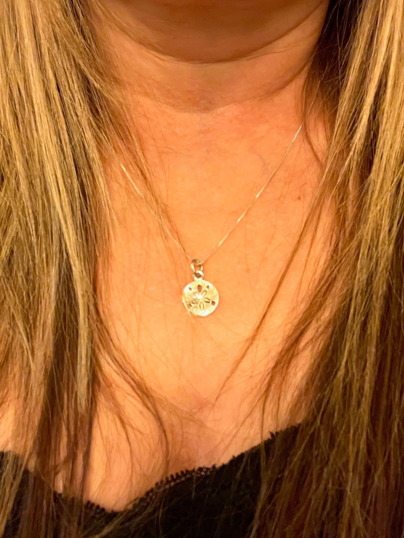 Our charming seashell sand dollar necklace silver pendant is crafted in .925 sterling silver. It's that time of year when we are thinking how pleasant it would be to take a trip to the beach. It is a great go to necklace if you're just looking for that minimalist wear everyday look to wear with your top, tank tops or dresses. It gives off that gentle, dainty yet feminine touch.