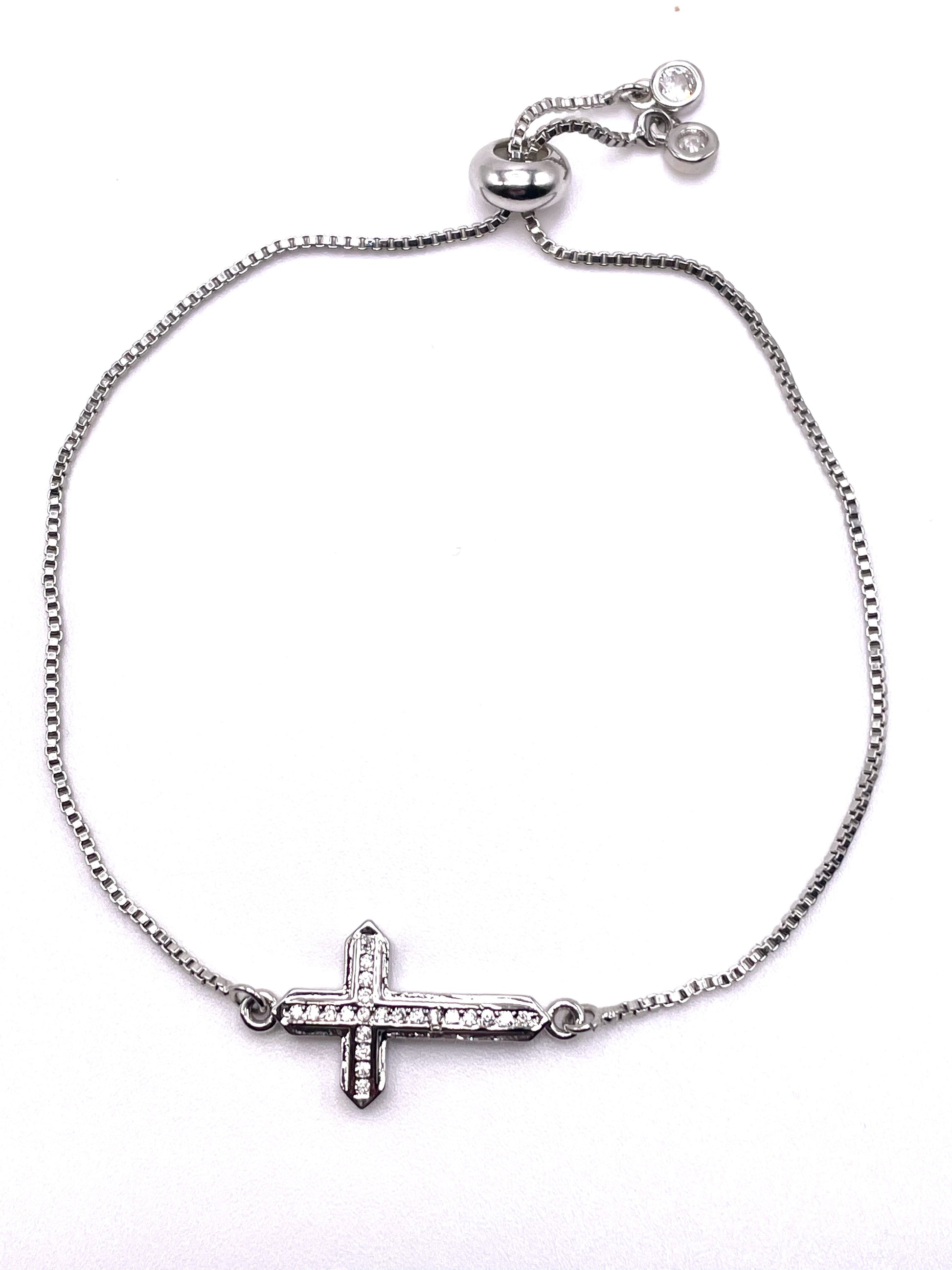 This beautiful, trending inspirational cross bracelet is available silver, and gold plated and accented with sparkling CZ stones. A lovely way to showcase your faith, this adjustable bolo bracelet looks stunning on the wrist. Wear it alone for a delicate statement or layer it with other bracelets to complete your look.