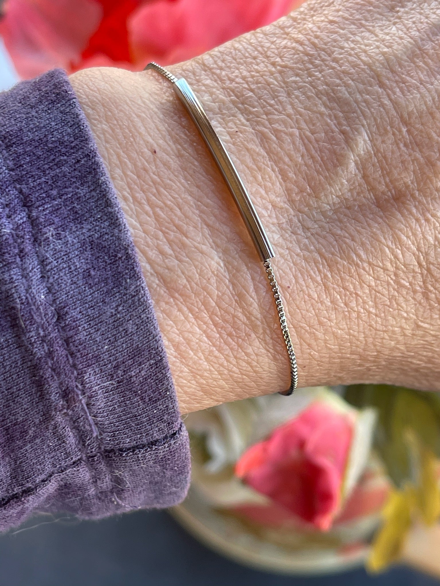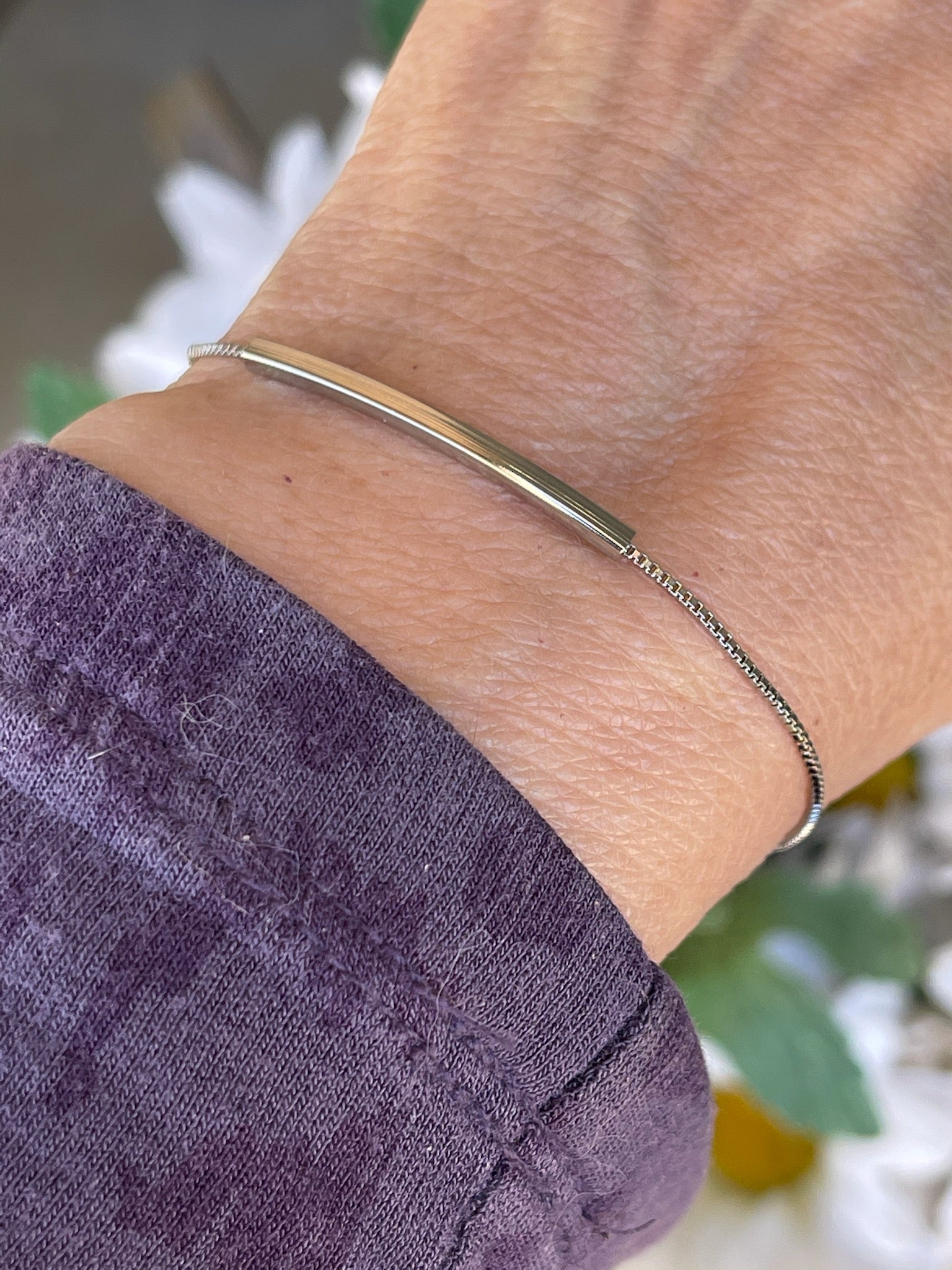 This delicate, minimalist .925 sterling silver bracelet, known as the Tube Box Bracelet, exudes simple elegance. Wear it alone for a refined, understated look or layer it with other bracelets for the trendy boho style everyone loves. A thoughtful and versatile gift for yourself, a loved one, mother, daughter, grandmother, or friend.