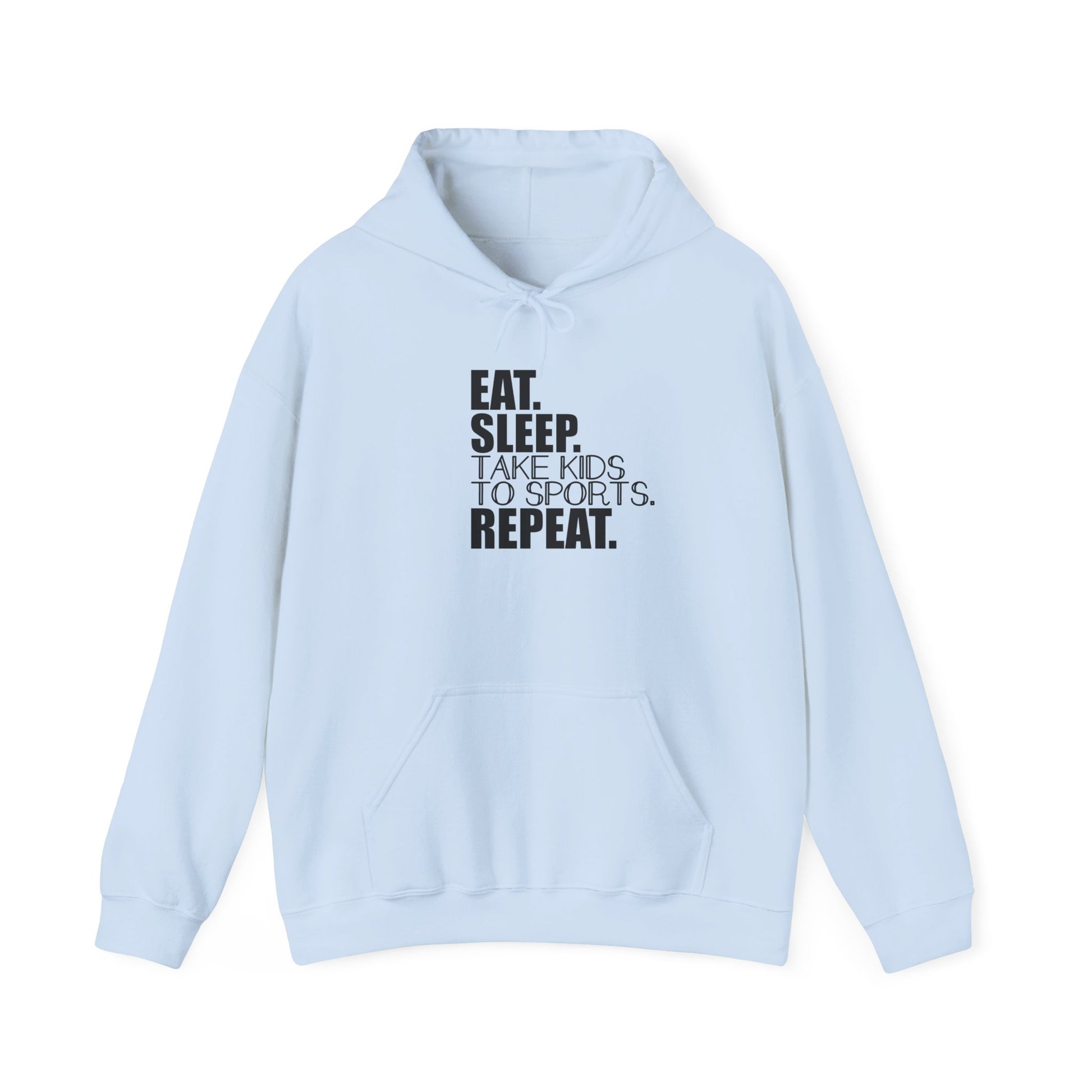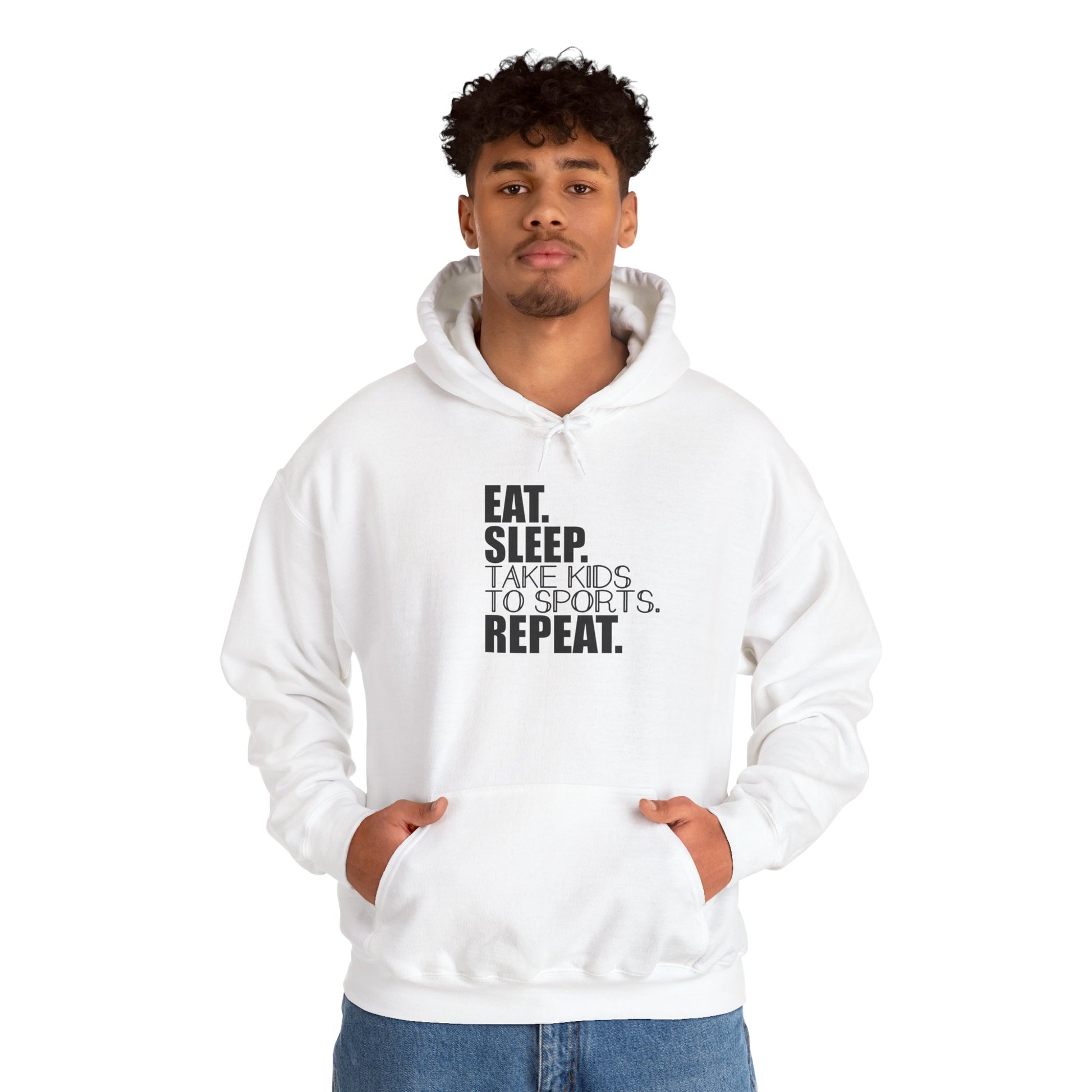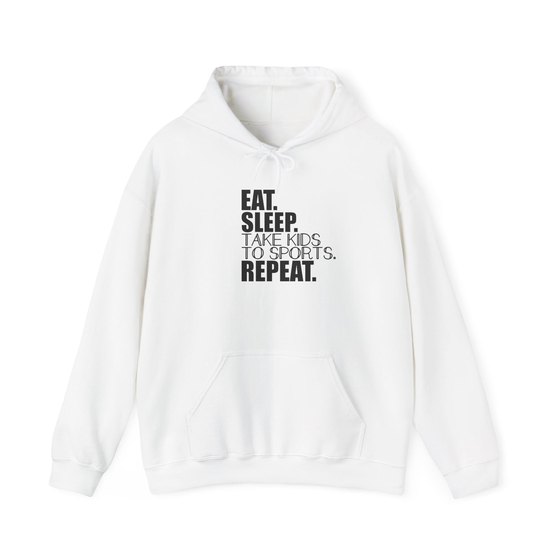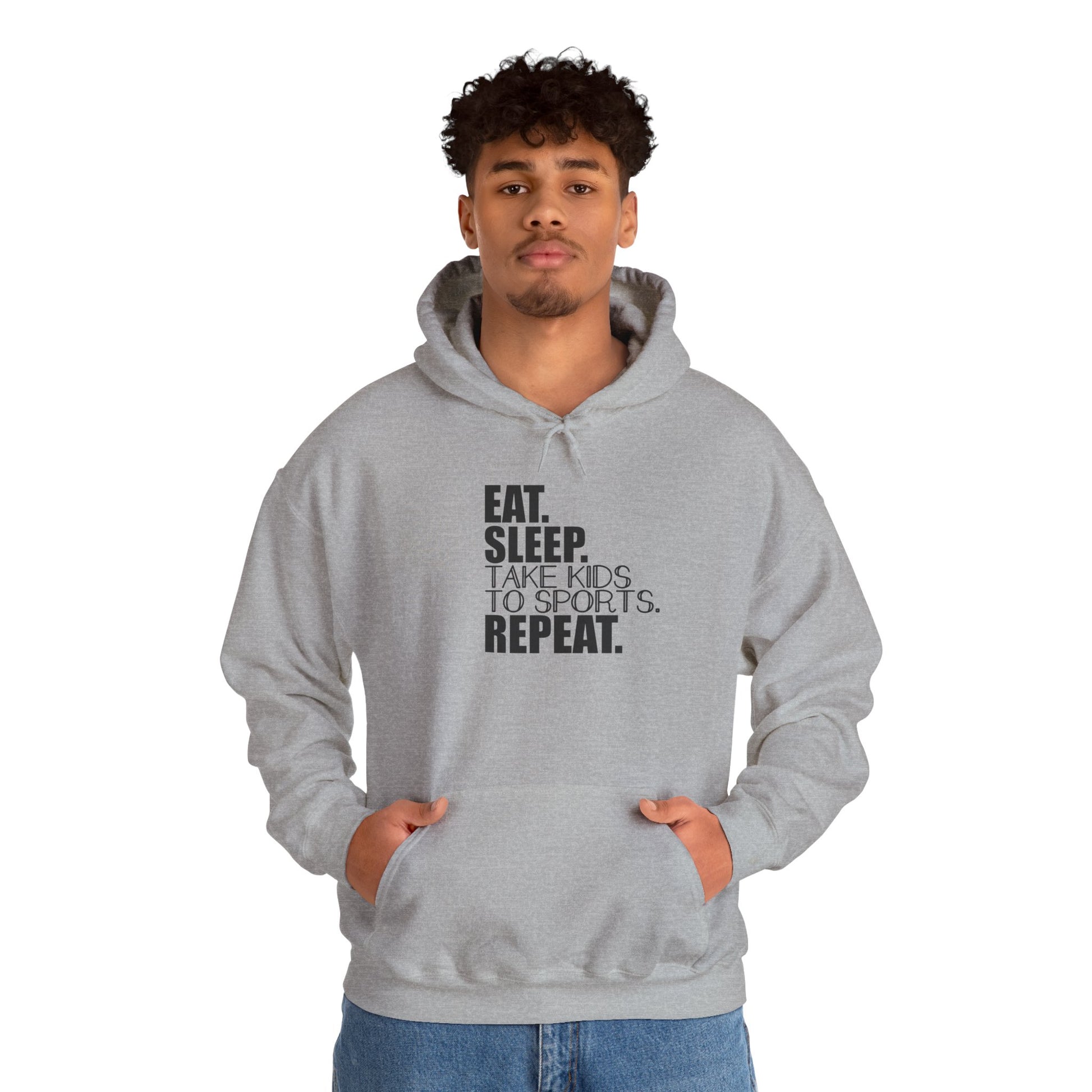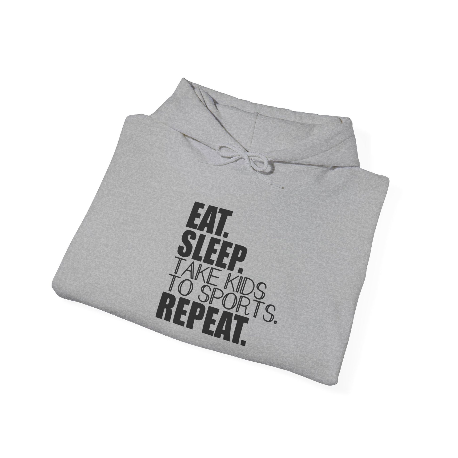 Unisex Heavy Blend™ Hooded Sweatshirt Reads, " Eat. Sleep. Take Kids to Sports. Repeat.